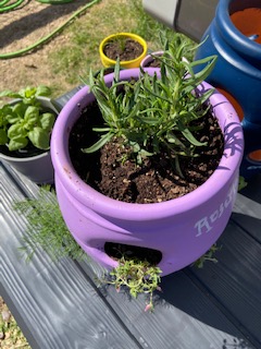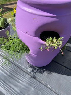 We ordered the Garlic Chives, Basils, Parsley, Oregano, Thyme, and Cilantro from Lettuce Grow. The Rosemary and Dill, I got from Home Depot. We decided to put these in their own pots with soil. The taller pots are actually strawberry planters. We “repurposed” them for our little herb garden. We like the strawberry planters as you can do seven plants in each one. We put rosemary at the top of one of the strawberry planters, since it likes to take over any space it is placed in. In the other planter, we put basil at the top since the basil plant we bought had several stocks.